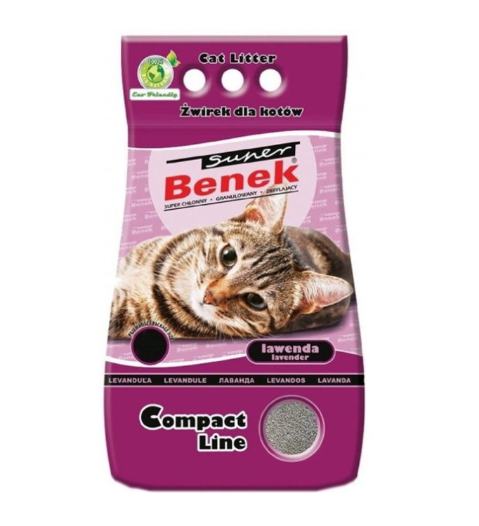 Super Benek Compact Lavendel on kassiliiv, mis on valmistatud 100% looduslikust parima kvaliteediga bentoniidist. See imab kiiresti vedelikke, tekitades lamedaid tükke. See neelab kiiresti ebameeldivad lõhnad ja lavendli aroom loob kasside liivakasti ümber meeldiva atmosfääri. Kassiliival on peened graanulid, mis on kasssi käppadele õrnad.
