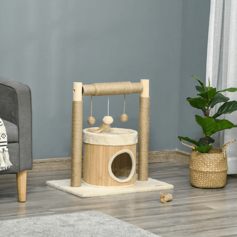 Meow BAMBUS kassimaja kriimustuspostide ja mängupallidega, beež 60 x 40 x 60 cm