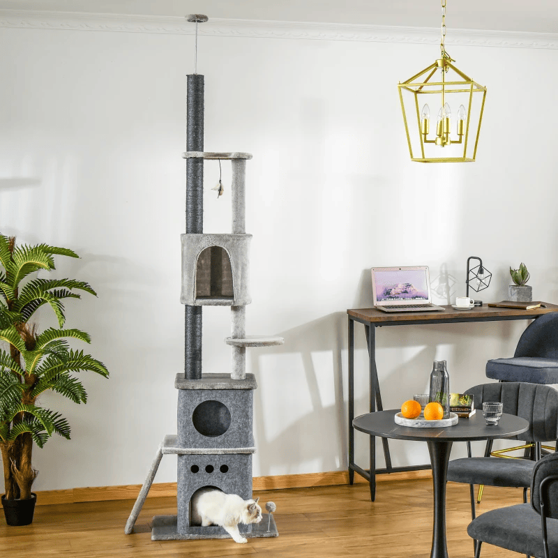 See kraapimispuu on magamiskoht, mänguväljak ja kraapimispost kõik ühes. Kassi kriimustuspost on reguleeritava kõrgusega ja seda saab kinnitada lakke. Mitmetasandiline kassi kraapimispuu sisal köiesammaste, platvormide, kassikorvi, avara majakese ja kassimänguasjaga lõputuks meelelahutuseks.