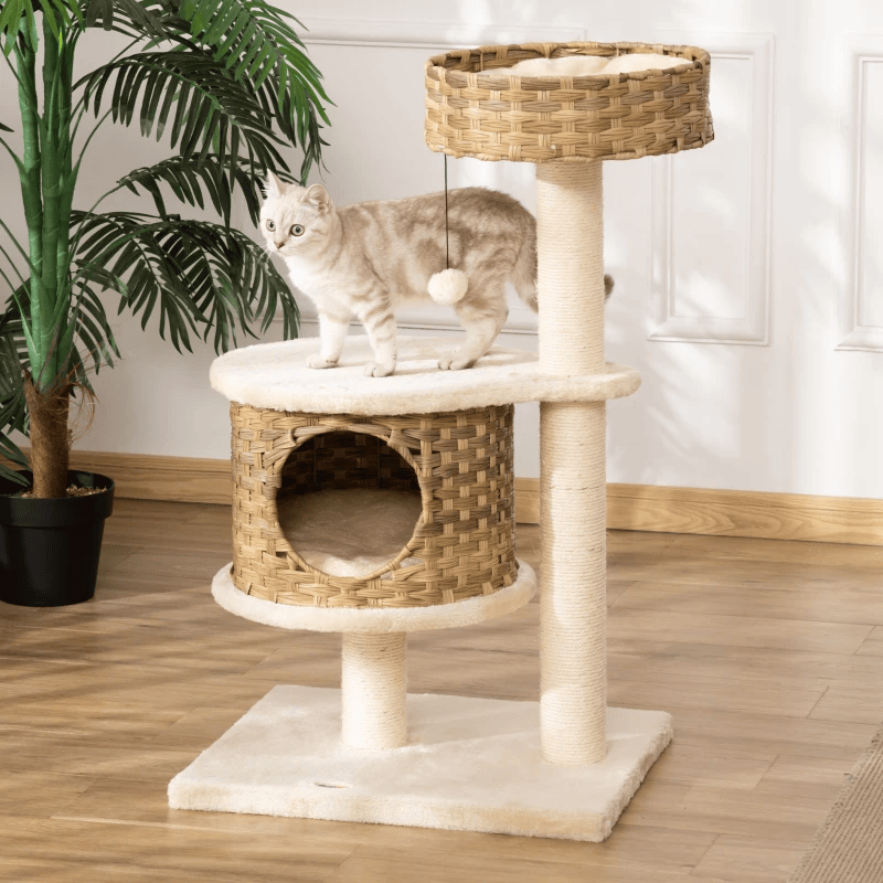 Mitmetasandiline kassi tegevuskeskus, kus on sisalköis, erinevad tasemed ja rippuv pall lõputuks meelelahutuseks. Valmistatud tugevast puitlaastplaadist, et kogu kriimustuspost oleks tugev ja stabiilne. Kassimaja on valmistatud PE rotangist. Kate on valmistatud pehmest ja mugavast materjalist ning kaasas on pehmed padjad (mitte pestavad).