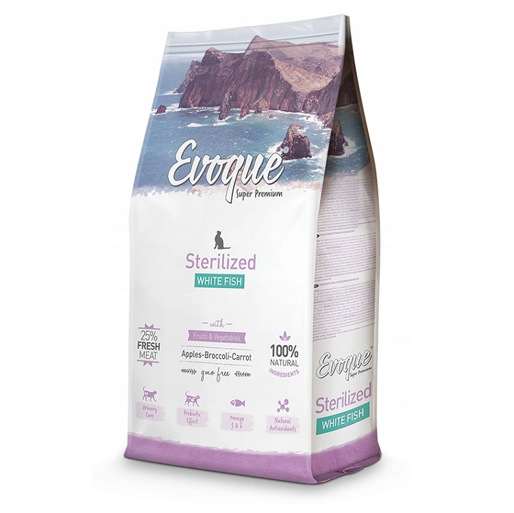 EVOQUE valge kalaga kuivtoit steriliseeritud kassidele.
