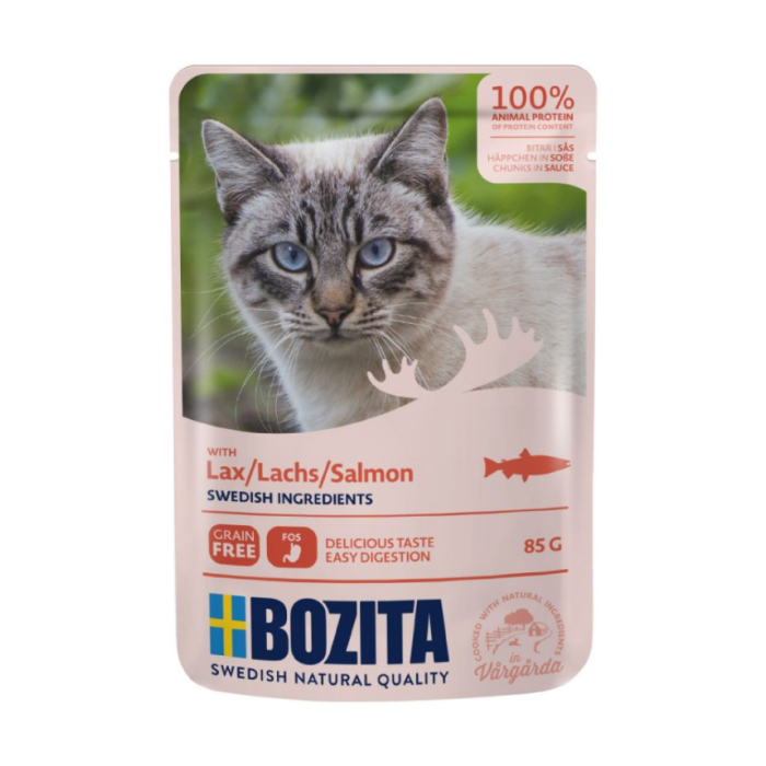 Bozita kassitoit kastmes lõhega - kassikonservi muudab eriti hõrguks Rootsi põhjaosa looduslikest vetest pärinev lõhe. Looduslikes vetes kasvanud lõhe eristub selgelt hõrgu maitse ning Omega 3 ja 6 rasvhapete kõrge taseme poolest.
