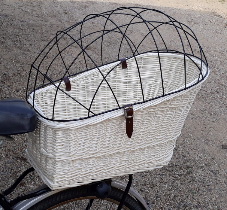Punutud transpordikorv jalgratta pakiraamile, korvi küljes on metallist kinnitussüsteem, mida saab reguleerida ning kinnitada iga laiusega pakiraamile. Korvil on pealmine metallist võre, mis kinnitub kolme nahast rihmaga (reguleeritavad) korvi külge, et Sinu lemmik ei saaks sõidu ajal korvist välja hüpata. Metallist võre on täielikult eemaldatav, muutes korvi kasutamise eesmärki - saad seda kasutada näiteks lihtsalt rattakorvina asjade hoidmiseks. Korvi maksimaalne kandevõime 20 kg. Korvi põhjas on pehme padi.