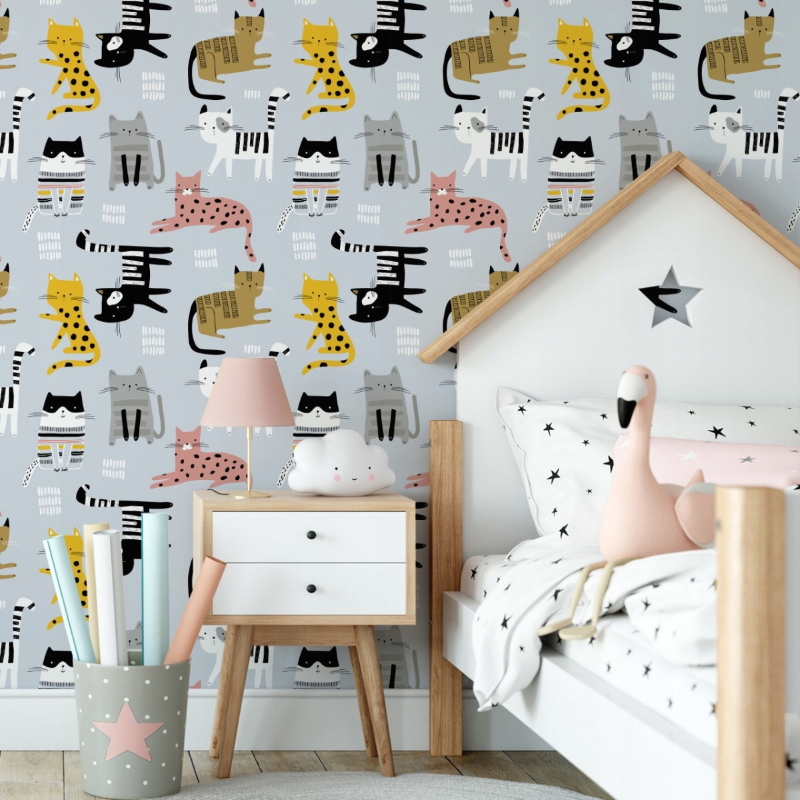 Seinatapeet AMAZED CATS, vanaroosa-sinepikollane ja hall