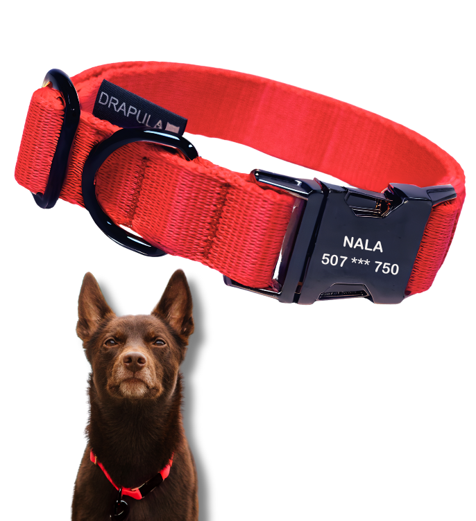 Punane elegantne kaelarihm mustade kinnitustega. DURAFLEX lukustussüsteem.