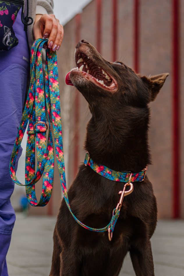 Vahva kangamustriga kaelarihm mustade kinnitustega.