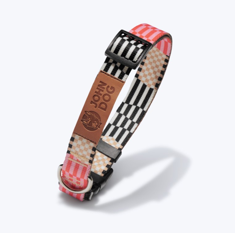 Kerge ja vastupidav kaelarihm koertele, valmistatud kvaliteetsest ja tugevast materjalist. Rihma kaunistab kirju John Dog PARIS seeria muster, kinnituseks on plastikust pistlukk. Rihma pikkus on reguleeritav, saadaval kolmes suuruses: