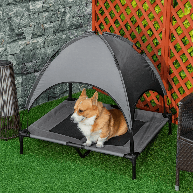 Lamavas stiilis tõstetud koeravoodi seisab 18 cm kõrgusel maapinnast, kaitseb teie lemmiklooma putukate, kahjurite või mustuse eest. Võrkkate on hingav ja tagab kuumuses õige termoregulatsiooni. Eemaldatav varikatus annab teie lemmikloomale piisavalt varju. Lihtsalt kinnitage nööridega soovitud asendisse. Pulbervärvitud metallraam tagab kõrge stabiilsuse ja kandevõime kuni 20 kg. Lamav pind on valmistatud oxfordist ja võrgust, väga lihtne puhastada ja vastupidav. Kerge kaal ja kaasaskantav disain muudavad koera lamamistooli transportimise lihtsaks.