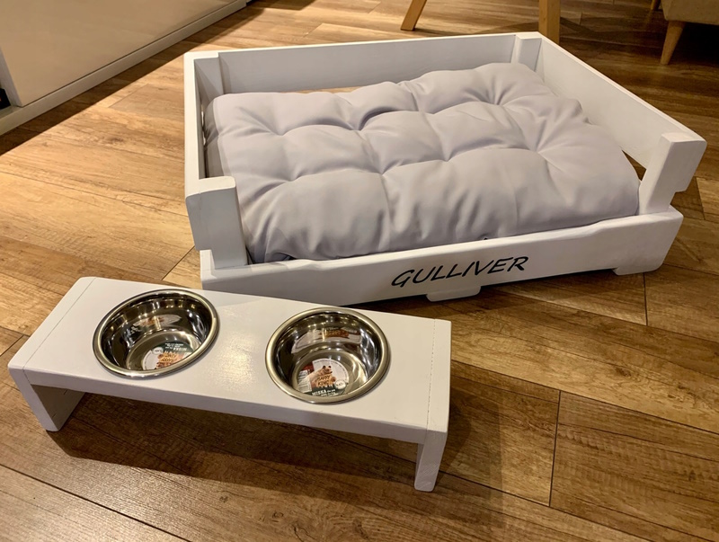 Wiklin täispuidust koeravoodi koos toidukausialusega, kaussidega ja padjaga. Valge raam. Saadaval erinevad padja värvid.