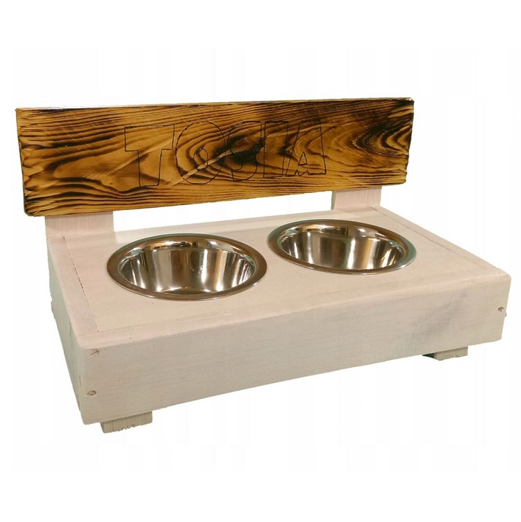 Taaskasutatud naturaalsest puidust käsitööna valmistatud toidukausialus kahe kausiga. Iga disain on ainulaadne. Ühe kausi maht 0.47l.