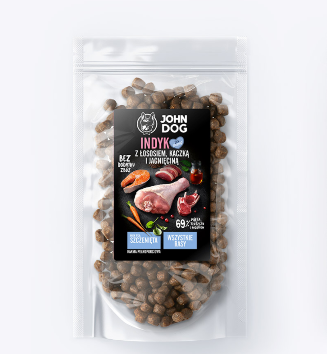 John Dog INDYK teraviljavaba koera täissööt kutsikatele, kalkun+lõhe+talleliha+part, NÄIDIS 120g *2.9€