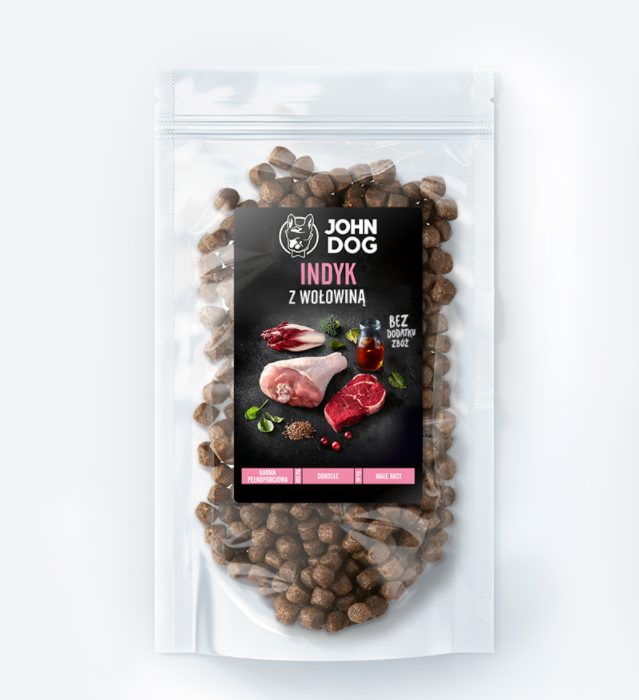 John Dog INDYK teraviljavaba koera täissööt väikestele tõugudele, kalkun+veiseliha, NÄIDIS 120g *2.9€