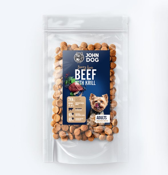 John Dog BERRY LINE teraviljavaba koerte kuivtoit väikeste ja keskmiste tõugude kutsikatele, veiseliha+kirill, NÄIDIS 120g *3€