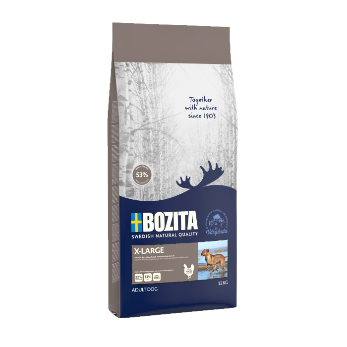 Bozita X-Large on täissööt normaalse aktiivsusega suuremat tõugu täiskasvanud koerale. Bozita X-Large koeratoit on valmistatud värskest kanalihast ja sellel on hästi tasakaalustatud toiteaineline koostis.