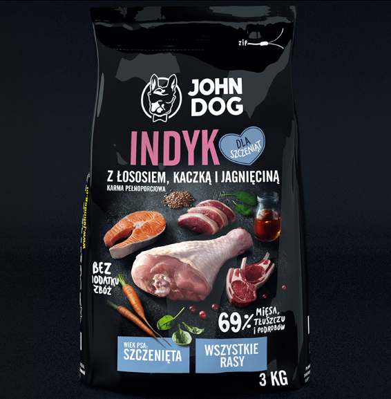 John Dog INDYK teraviljavaba koera täissööt kutsikatele, kalkun+lõhe+talleliha+ part, 3kg