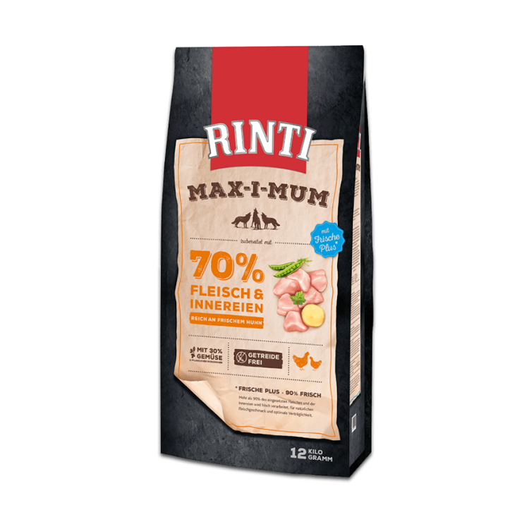 Rinti Max-i-Mum teraviljavaba kuivtoit on valmistatud 65% värskest lihast. Vähendatud rasva- ja valgusisaldus ning suurenenud E-vitamiini sisaldus toetab seedimist. Koerad on loomult lihasööjad, mistõttu Rinti Max-i-Mum sisaldab suures koguses värsket liha.