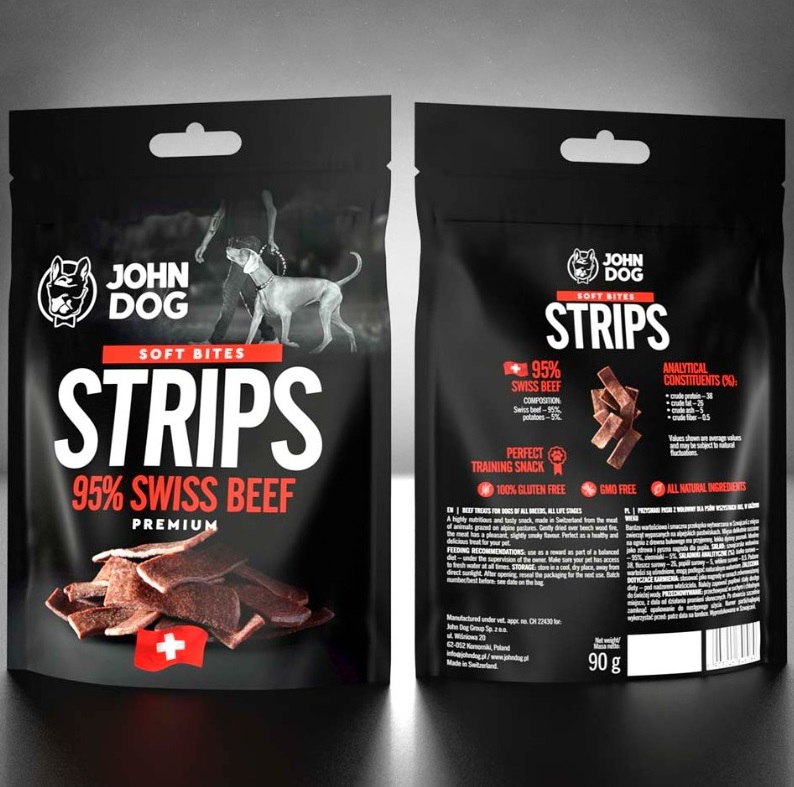 John Dog SWISS TREATS on Šveitsist pärit veiselihast valmistatud poolpehmed maiuseribad, millel on suitsune aroom. Kuumtöödeldud 95°C juures. Gluteenivaba.