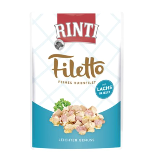 RINTI Filetto õrna kanafilee ja lõhega märgtoit on valmistatud hoolikalt valitud kanafileetükkidest, mis sisaldavad rohkelt valke ja vähe rasva. Toidule on lisatud koertele vajalikke vitamiine, mineraale ja mikroelemente. Sobilik kõikidele tõugudele ja eelkõige täiskasvanud koertele.