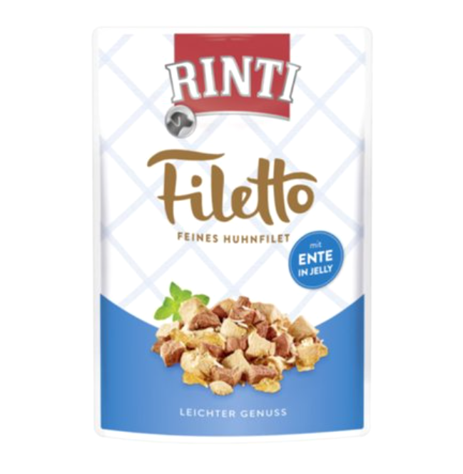 RINTI Filetto õrna kanafilee ja pardilihaga märgtoit on valmistatud hoolikalt valitud kanafileetükkidest, mis sisaldavad rohkelt valke ja vähe rasva. Toidule on lisatud koertele vajalikke vitamiine, mineraale ja mikroelemente. Sobilik kõikidele tõugudele ja eelkõige täiskasvanud koertele.