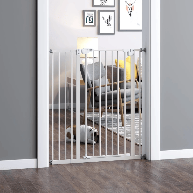 Täiskasvanud saavad ukse ühe käega avada, libistades ülaosas olevat nuppu. (Peate mõlemad otsad korraga suruma ja seejärel üles tõstma). Põhjas olevad 2 pöörlevat hinge võimaldavad ukse kiikumist mõlemas suunas. Uksekaitse on varustatud kahekordse lukustusmehhanismiga, et hoida teie lemmiklooma ohutult. Valmistatud pihustustöödeldud metallraamist, et tagada tugevus. Trepivärava pind on pliivaba ja mittetoksiline. Värav sobib ainult avasse 74cm kuni 80cm, 91,5cm kuni 97,5cm, palun mõõtke enne ostmist ava, kuhu soovite turvaaia paigaldada.