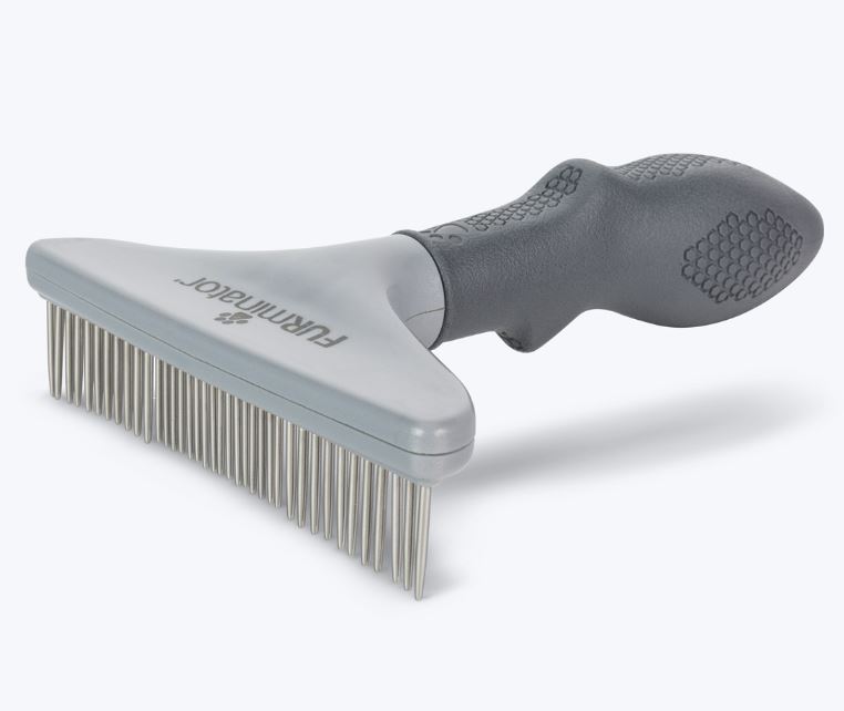 FURminator lai kamm - sobib koertele ja kassidele, eriti paksemale karvale. Ergonoomilise libisemiskindla käepidemega. Roostevabast terasest piid, mis ei ärrita nahka - need tiirlevad 360 kraadi, mis lisaks minimeerib karvade sakutamist.