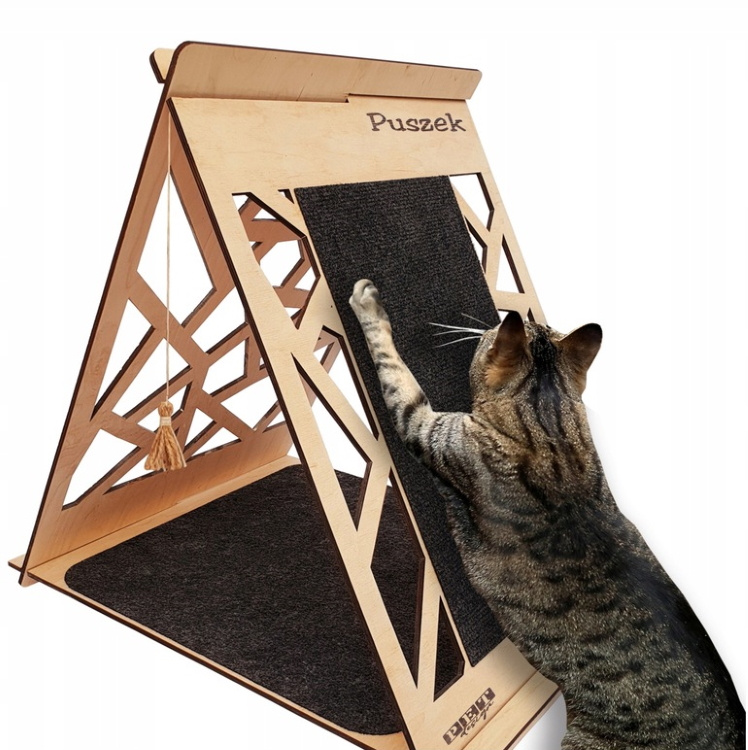 Puitvineerist kassimaja, mille sees ning väljas kare kraapimisvaip. Mängulusti lisab naturaalsest džuudist riputatav tups.