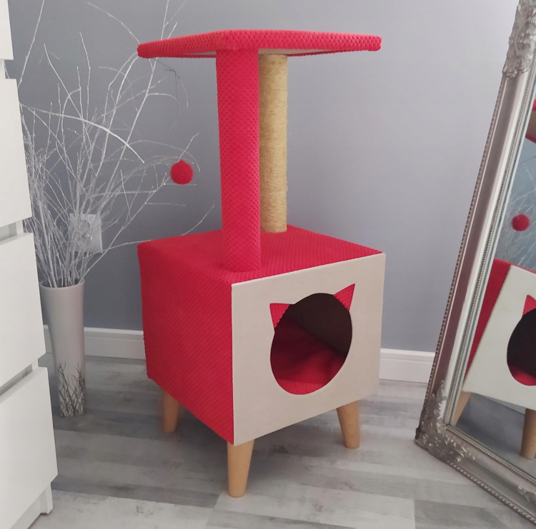Pildil on vaarikapunane kraapimismaja beeži esiosa ning naturaalsete mööblijalgadega.