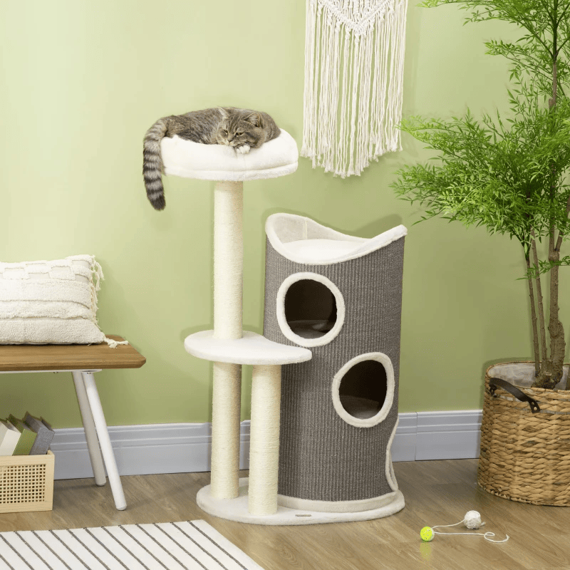 Meow kolmekorruselise maja ja kraapimispostidega kassipuu, hall 60 cm x 44,5 cm x 109 cm