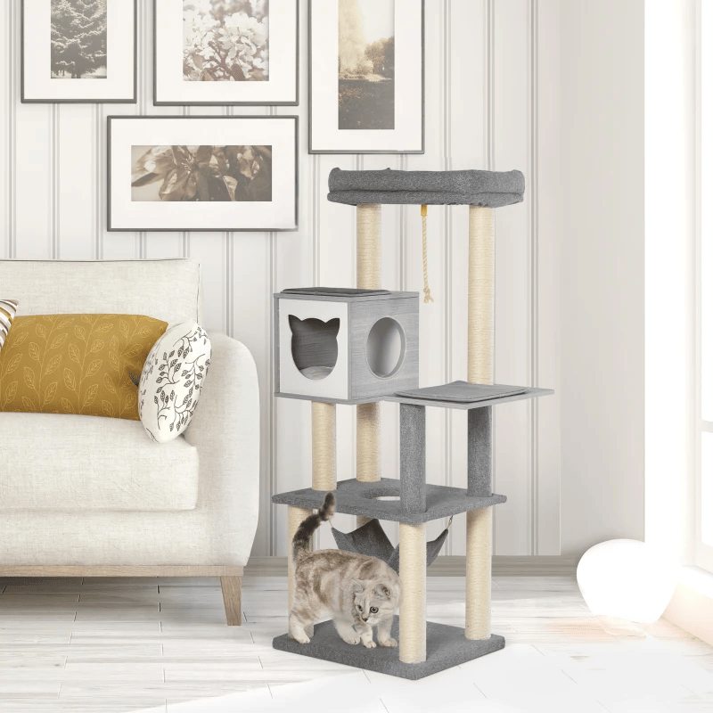 Meow mitmetasandiline ronimispuu /tegevuskeskus kassidele, võrkkiige ja pehme padjaga, hall + valge 59x48x155 cm