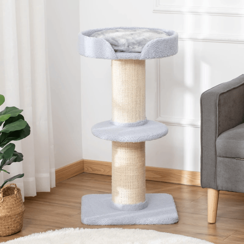 Meow pehmest plüüsist kahe tasapinnaga kraapimispuu, helehall 45 x 45 x 91cm