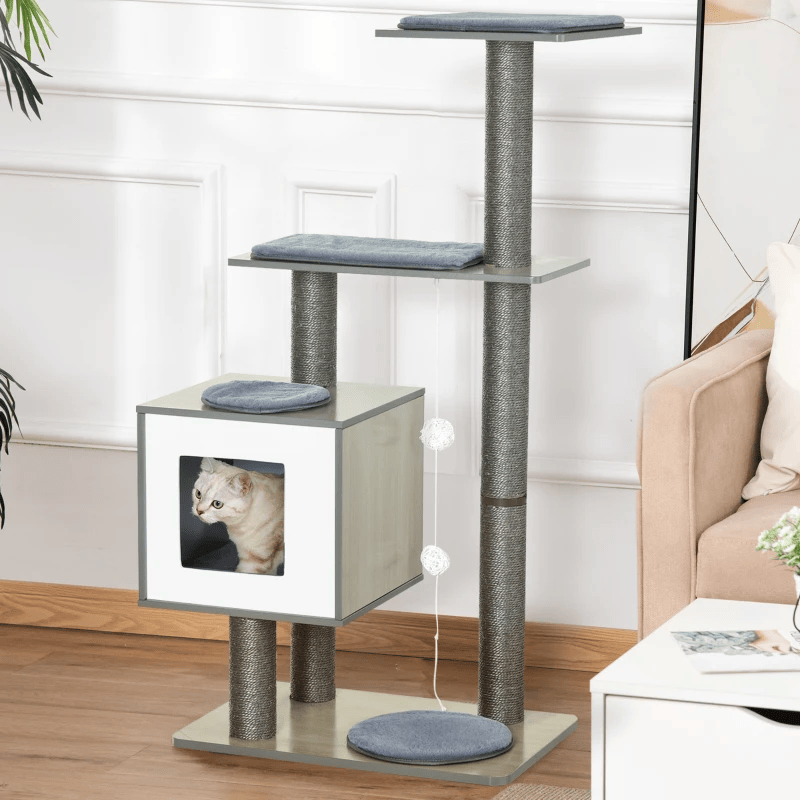 Neli erineva kõrgusega taset, peidukoht, sisal-mähitud sambad ja kaks rippuvat mängupalli muudavad kassipuu teie kassi jaoks mitmekülgseks tegevuseks.