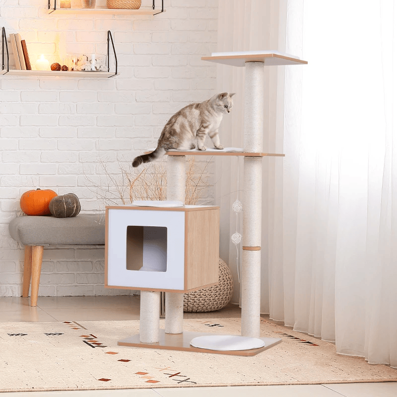 Neli erineva kõrgusega taset, peidukoht, sisal-mähitud sambad ja kaks rippuvat mängupalli muudavad kassipuu teie kassi jaoks mitmekülgseks tegevuseks.