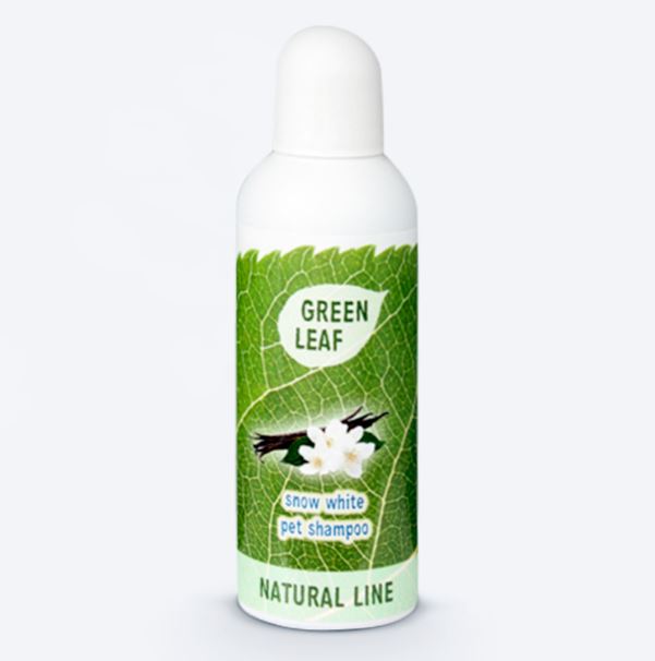 Green Leaf Snow White õrn šampoon, mis rõhutab karvkatte valget värvi. Ideaalne valge karvaga koerte jaoks.