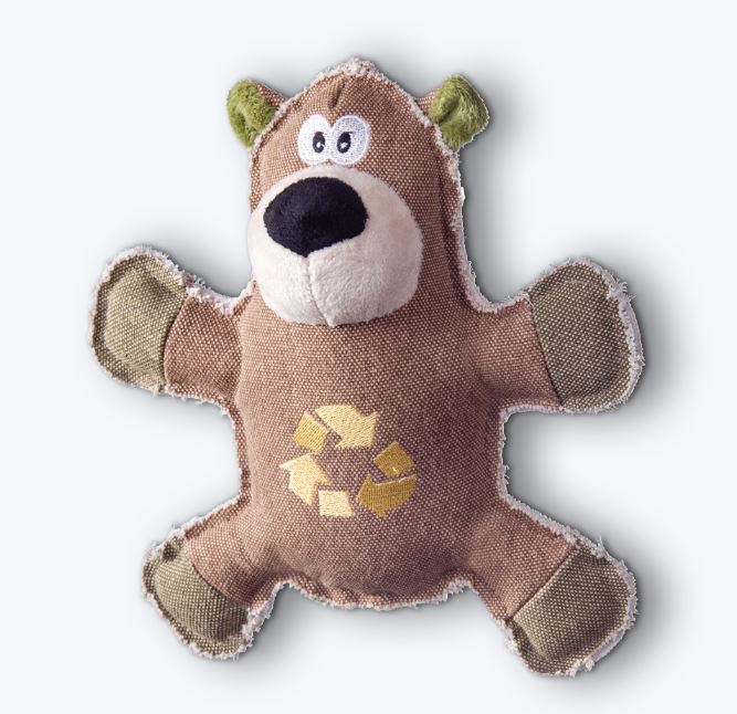 valmistatud paksemast ja tugevamast kangast. Vastupidav ja tugevate õmblustega. Mänguasi on valmistatud taaskasutatud materjalidest ning selle sümboliseerimiseks on karu kõhule tikitud taaskasutuse märk.
