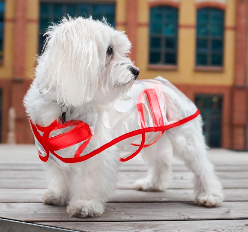 Paksust läbipaistvast kilest vihmamantel koertele. Kerge, ilma lisavooderduseta. Takjapaelast kinnitused (Velcro), mis annavad veidi ruumi reguleerimiseks. Lihtne selga panna