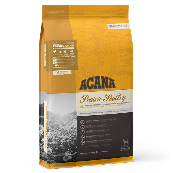 Koerad vajavad liharikast toitu, mis on kohandatud nende vajadustele ning mis sisaldab palju valke ja rasva. Sellel eesmärgil on välja töötatud Acana Prairie Poultry (kodulinnuliha), mis pakub teie koerale täisväärtuslikke toitaineid. Täistoit sisaldab vabapidamisel kana- ja kalkuniliha, milles on 50% liha- ja valgusisaldust, ning terveid mune. ACANA koeratoit ei sisalda kõrge glükeemilise indeksiga teravilja ja sisaldab selle asemel palju toitvat lihavalku, s.o 29%, ning asendamatuid oomega-3-rasvhappeid, mis toetavad koera tervist. Lisaks sisaldab toit madala glükeemilise tasemega kaera, et tagada stabiilne veresuhkru tase ja vähendada rasva säilitamise potentsiaali.