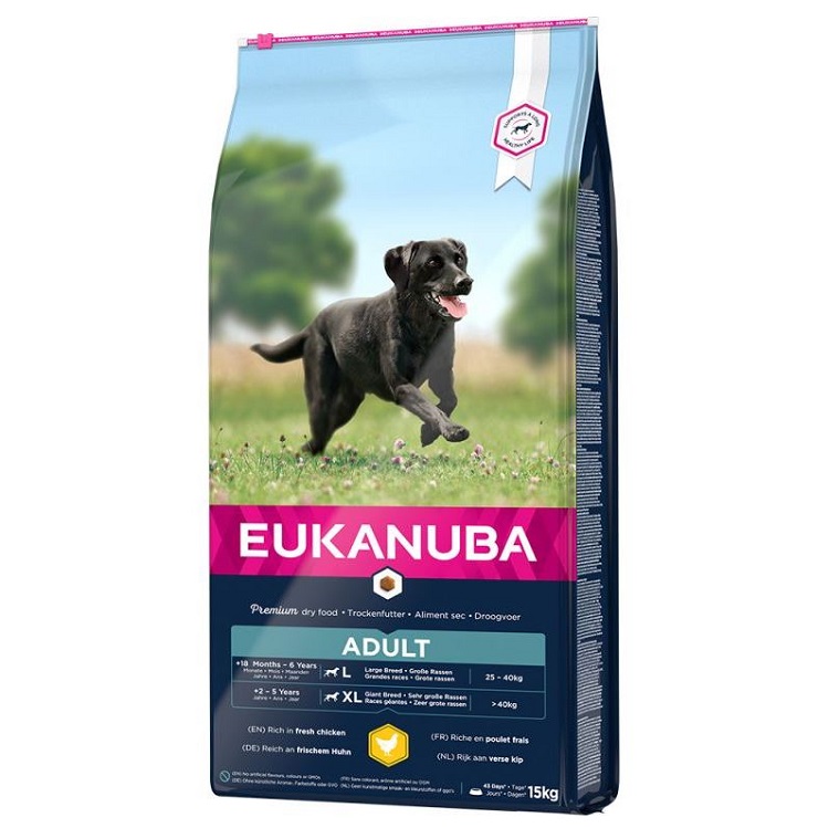 Täiskasvanud suurt tõugu koerad on sageli mitte ainult väga näljased, vaid neil on ka väga spetsiifilised toitumisvajadused. Eukanuba Adult Large Breed (kanaga) on suurepärane täistoit suurte ja väga suurte tõugude täiskasvanud koertele, kuna see on välja töötatud nende vajadusi silmas pidades.
