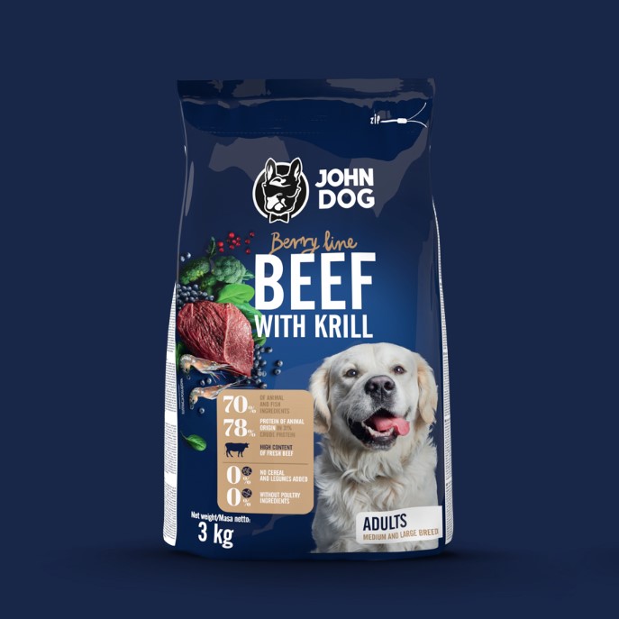 John Dog BERRY LINE teraviljavaba koerte kuivtoit keskmist ja suurt tõugu koertele, veiseliha+kirill, NÄIDIS 120g
