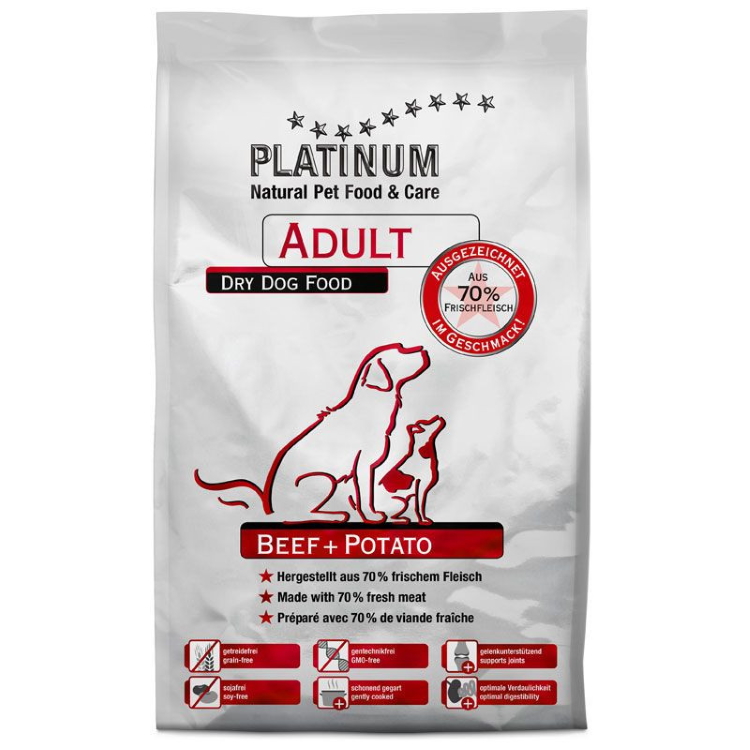 Täiskasvanud koertele mõeldud PLATINUM Adult Beef+Potato sobib tänu oma naturaalsele, tervislikule ja kergesti seeduvale koostisele kõigile koertele, olenemata vanusest või tõust. PLATINUM Adult Beef+Potato on välja töötatud spetsiaalselt toitumise parandamiseks ning ei sisalda lisaaineid, mis võiksid koerale kahjulikud olla. Toit sisaldab olulisi vitamiine tervise ja energia tagamiseks ning väärtuslikud ürdid soodustavad ainevahetust.