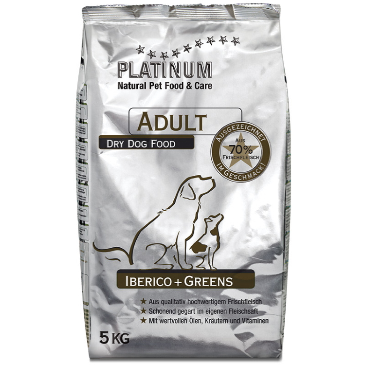 Täiskasvanud koertele mõeldud PLATINUM Adult Iberico+Greens sobib tänu oma naturaalsele, tervislikule ja kergesti seeduvale koostisele kõigile koertele, olenemata vanusest või tõust. PLATINUM Adult Iberico + Greens on välja töötatud spetsiaalselt toitumise parandamiseks ning ei sisalda lisaaineid, mis võiksid koerale kahjulikud olla. Toit sisaldab olulisi vitamiine tervise ja energia tagamiseks ning väärtuslikud ürdid soodustavad ainevahetust. Lisaks sellele, on Iberico+Greens esimene PLATINUMi kuivtoit, milles kasutatakse süsivesikute lisamiseks kartulit (ei sisalda teravilja).