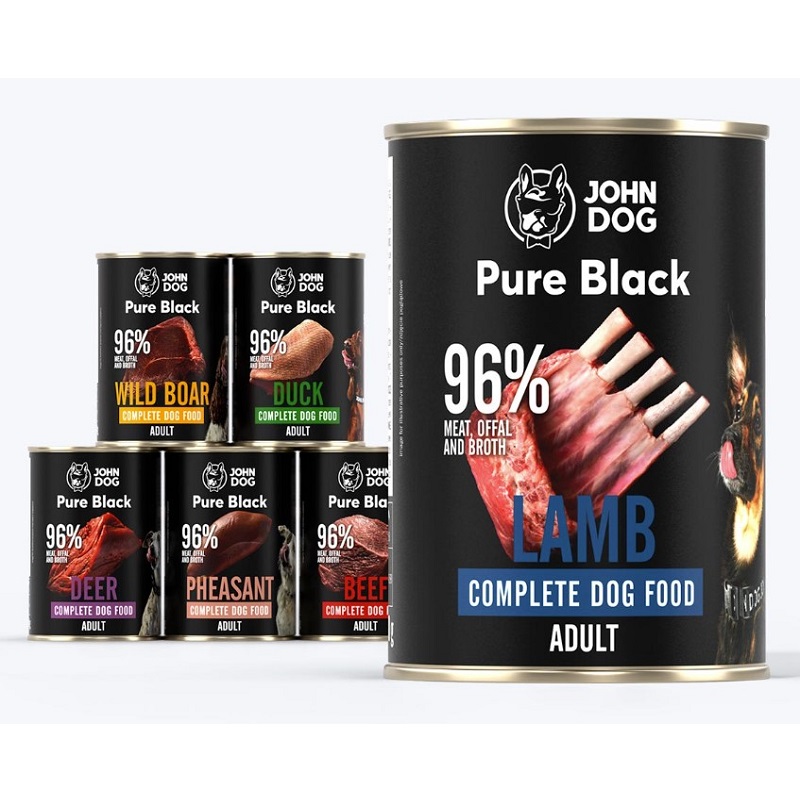 John Dog PURE BLACK täiskasvanud koerte märgtoidu komplekt, kuue erineva maitsega: