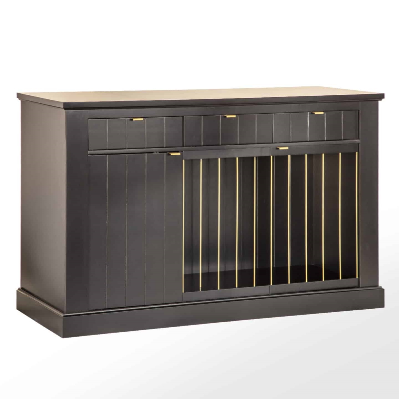Elegantses Deco stiilis täisfunktsionaalsesse kummutisse integreeritud koerapuur, mis on sobilik väikest ja keskmist tõugu koertele. Sisekujundusmaailmas on uus trend ja suund lisada interjööri funktsionaalset mööblit peredele, kellel on lemmikloomad. Suurepärane mööbliese esteetilist välimust armastavale koeraomanikule ning nõudlikule lemmikule - mahukad sahtlid, kinnine kahe riiuliga kapp koos koerapuuriga.