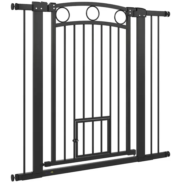 Kõrge turvavärava värav pakub kohandatavat laiust 76–104 cm ja kõrgust 96 cm, mis sobib ideaalselt enamiku treppide ja uste jaoks. Turvavärava saab sõltuvalt teie individuaalsetest vajadustest kinnitada kas survega, et vältida kahjustusi, või puurida seina kindlama lahenduse saamiseks. Kahekordse lukustussüsteemiga varustatud turvavärav võimaldab lihtsat juhtimist ühe käega, jääb kindlalt suletuks ja seda saab avada mõlemalt poolt. Sisseehitatud kassiuksega, ideaalne majapidamistele, kus on kassid ja koerad.